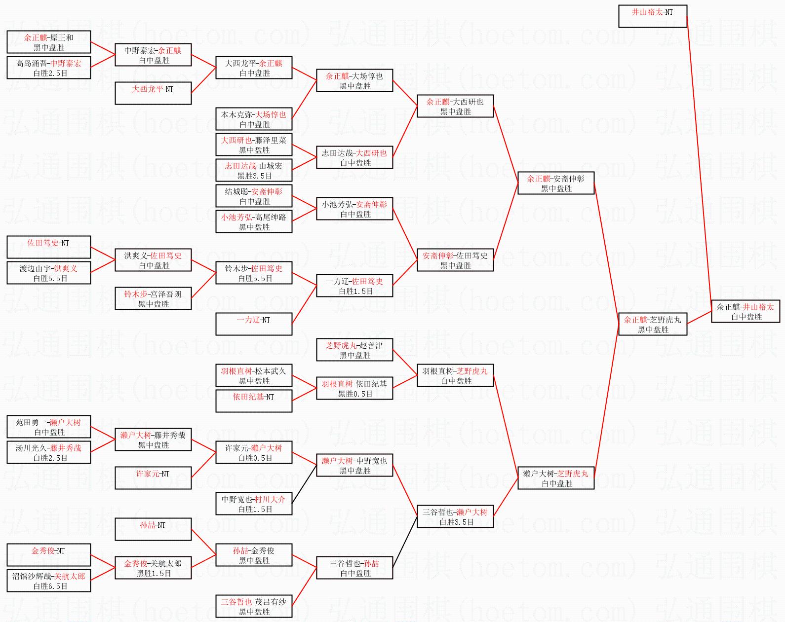 1.井山裕太获得冠军,余正麒获得亚军。决赛比分:井山裕太3:0余正麒。棋局: