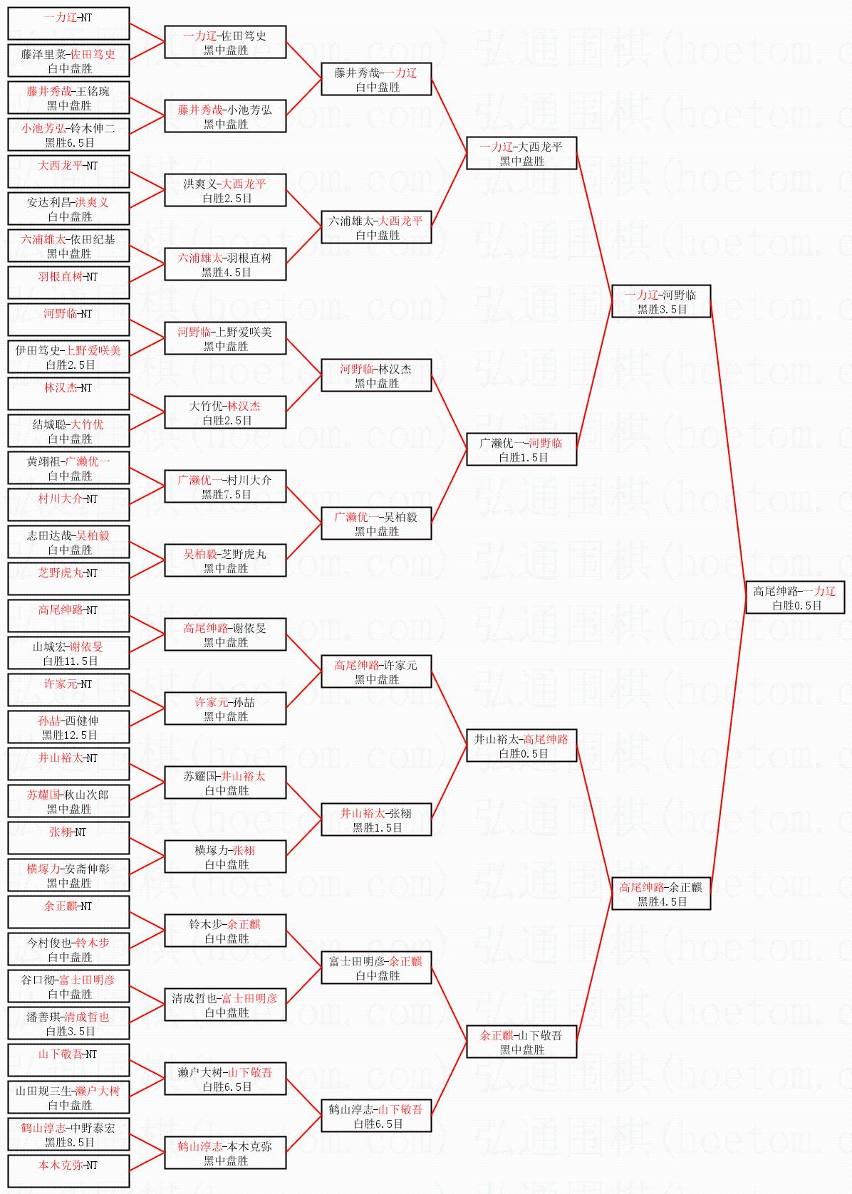 1.一力辽获得冠军,高尾绅路获得亚军。决赛比分:一力辽1:0高尾绅路。棋局:
