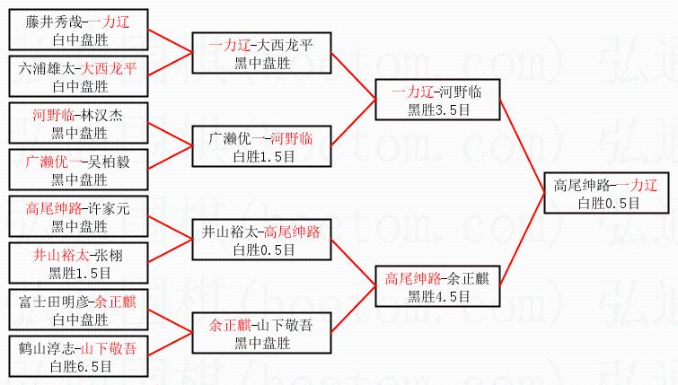 1.一力辽获得冠军,高尾绅路获得亚军。决赛比分:一力辽1:0高尾绅路。棋局:
