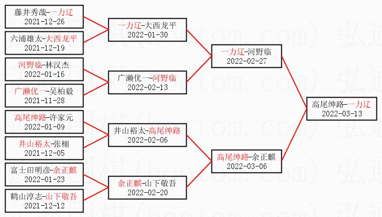 1.一力辽获得冠军,高尾绅路获得亚军。决赛比分:一力辽1:0高尾绅路。棋局: