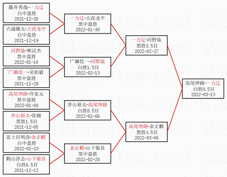 1.一力辽获得冠军,高尾绅路获得亚军。决赛比分:一力辽1:0高尾绅路。棋局: