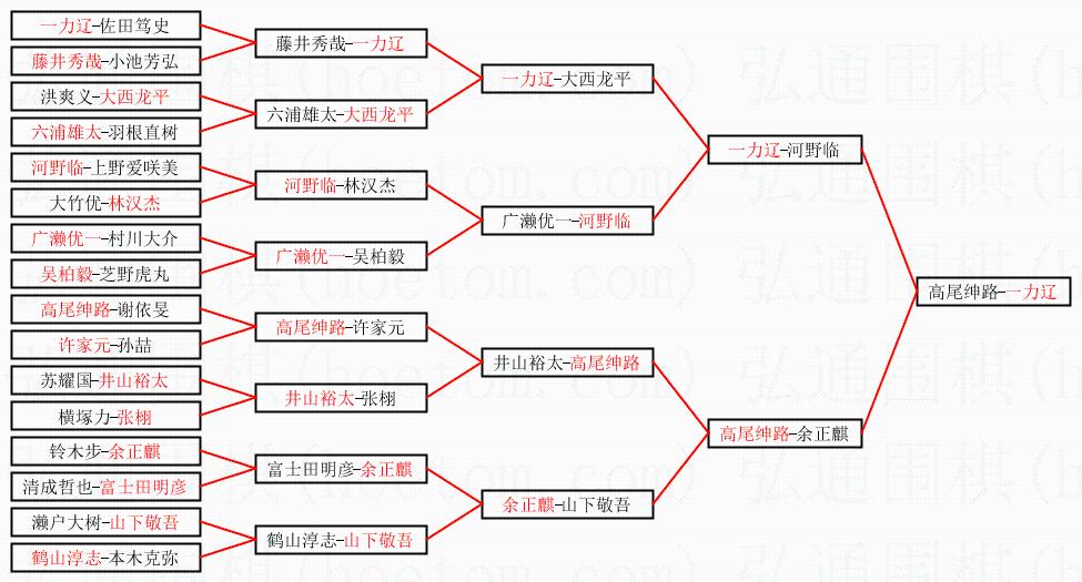 1.一力辽获得冠军,高尾绅路获得亚军。决赛比分:一力辽1:0高尾绅路。棋局: