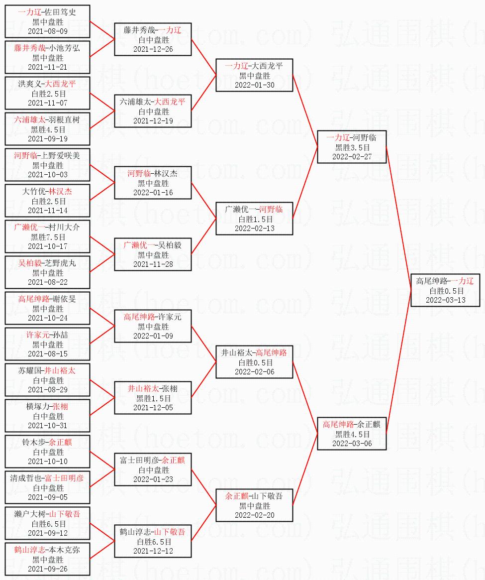 1.一力辽获得冠军,高尾绅路获得亚军。决赛比分:一力辽1:0高尾绅路。棋局:
