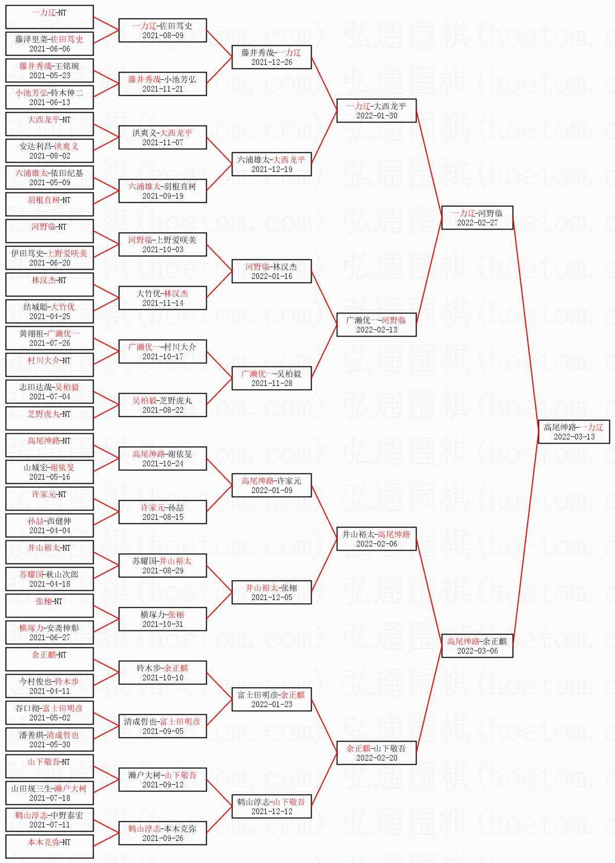 1.一力辽获得冠军,高尾绅路获得亚军。决赛比分:一力辽1:0高尾绅路。棋局: