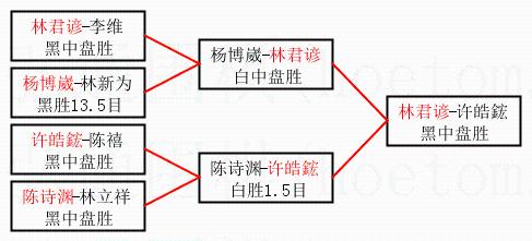| 1.林君谚获得冠军,许皓鋐获得亚军。决赛比分:林君谚4:2许皓鋐。棋局: | ||