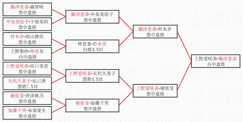 1.藤泽里菜获得冠军,上野爱咲美获得亚军。决赛比分:藤泽里菜1:0上野爱咲美。棋局: