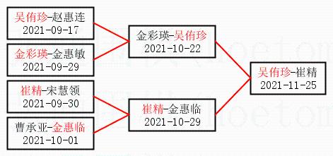 1.吴侑珍获得冠军,崔精获得亚军。决赛比分:吴侑珍2:1崔精。棋局:
