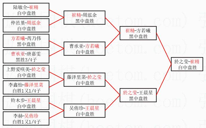 | 1.崔精获得冠军,於之莹获得亚军。决赛比分:崔精2:1於之莹。棋局: | ||