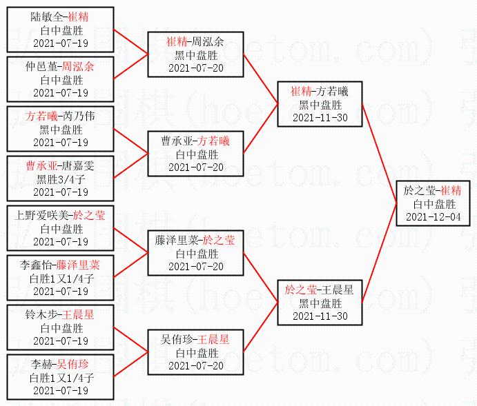 1.崔精获得冠军,於之莹获得亚军。决赛比分:崔精2:1於之莹。棋局: