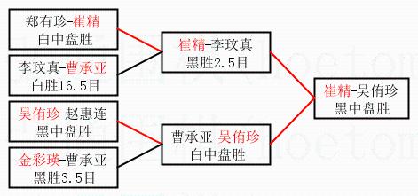 | 1.崔精获得冠军,吴侑珍获得亚军。决赛比分:崔精3:1吴侑珍。棋局: | ||