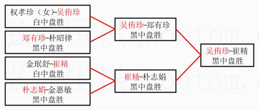 | 1.吴侑珍获得冠军,崔精获得亚军。决赛比分:吴侑珍2:0崔精。棋局: | ||
