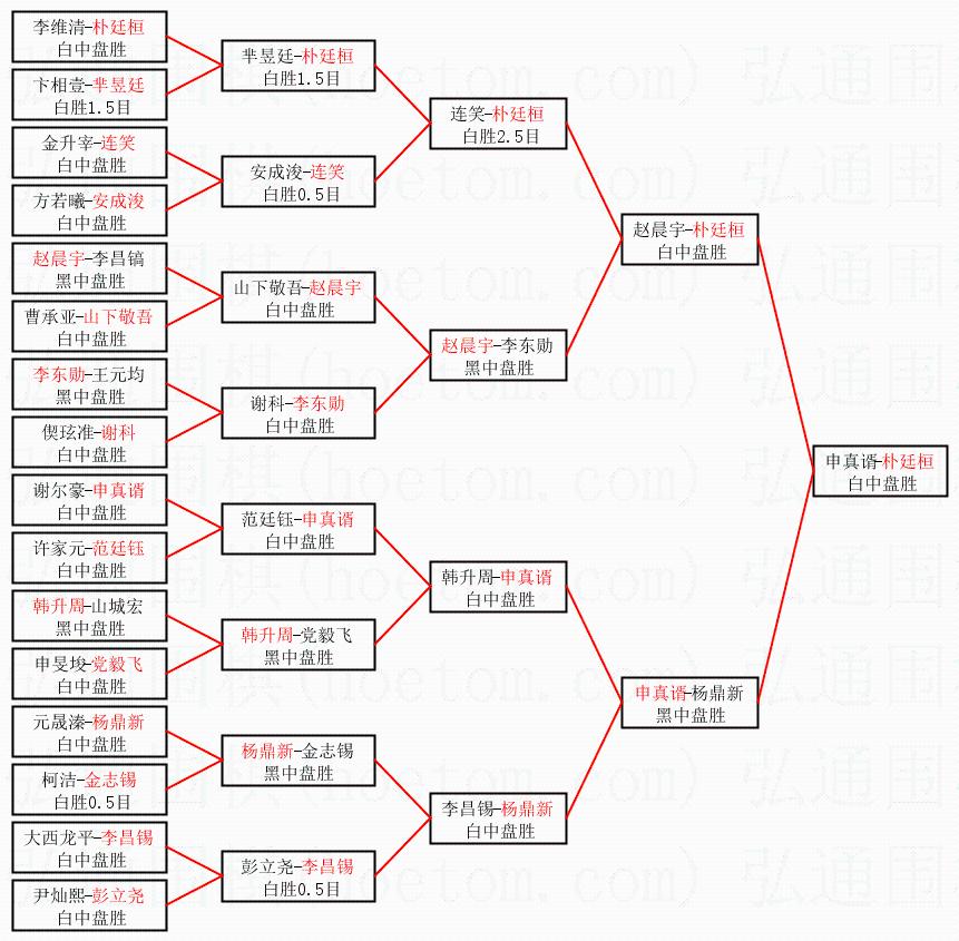 | 1.朴廷桓获得冠军,申真谞获得亚军。决赛比分:朴廷桓2:1申真谞。棋局: | ||