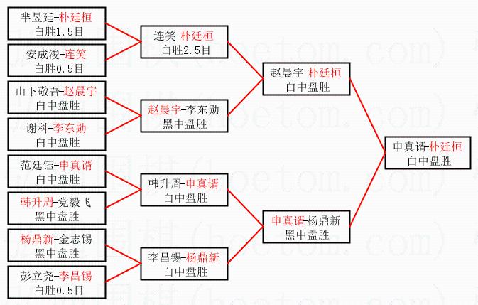 | 1.朴廷桓获得冠军,申真谞获得亚军。决赛比分:朴廷桓2:1申真谞。棋局: | ||