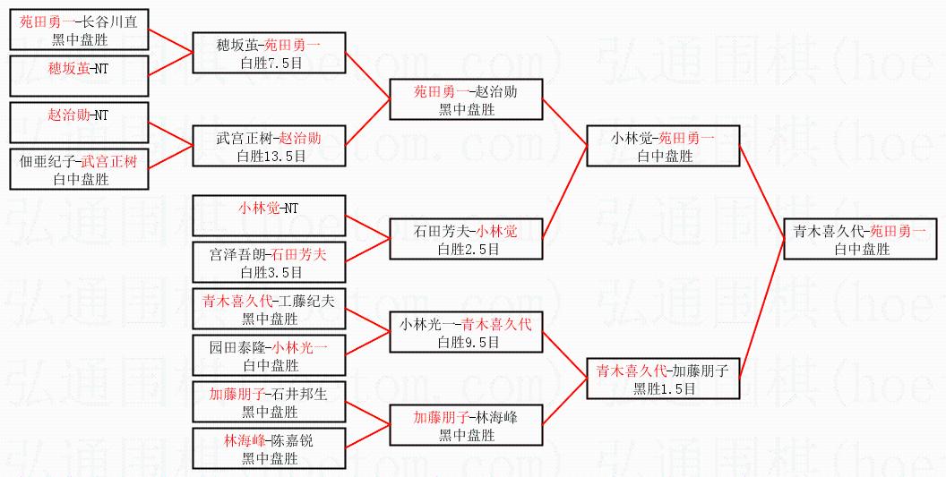 1.苑田勇一获得冠军,青木喜久代获得亚军。决赛比分:苑田勇一1:0青木喜久代。棋局: