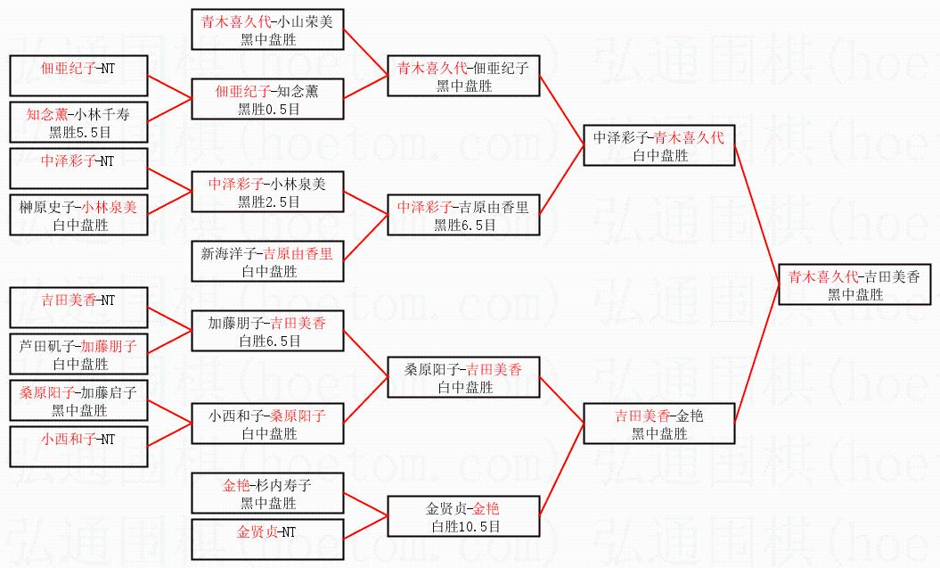1.青木喜久代获得冠军,吉田美香获得亚军。决赛比分:青木喜久代1:0吉田美香。棋局: