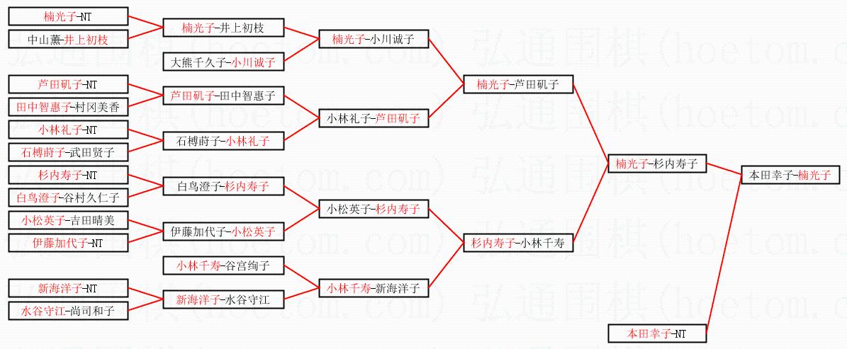 1.楠光子获得冠军,本田幸子获得亚军。决赛比分:楠光子2:1本田幸子。棋局: