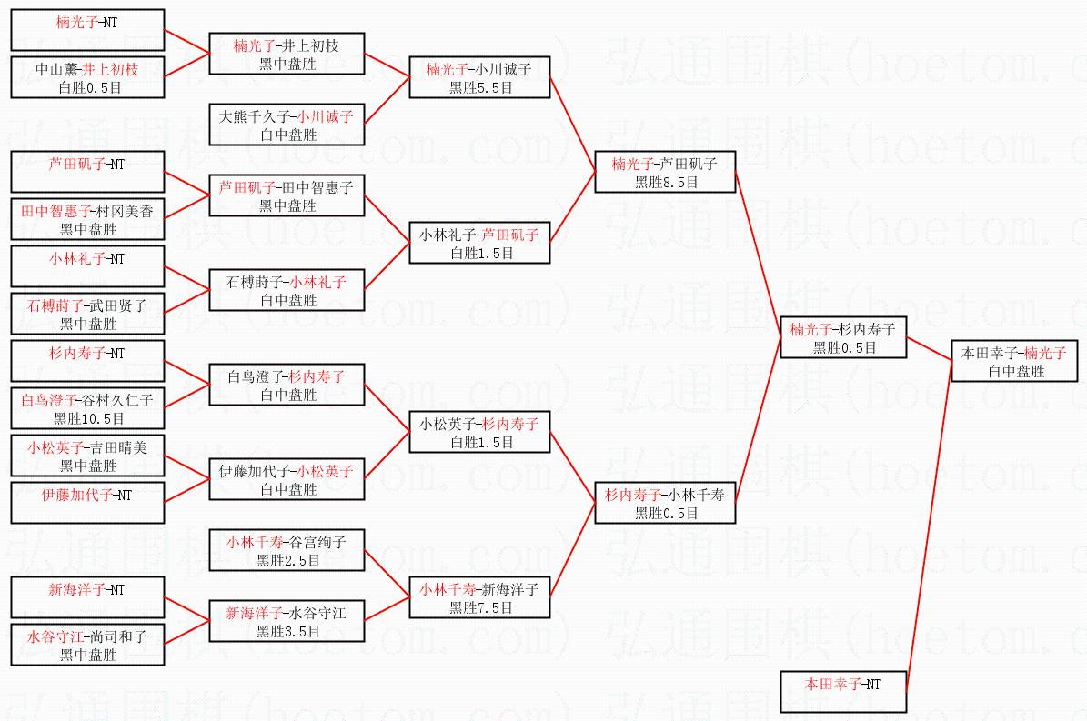 1.楠光子获得冠军,本田幸子获得亚军。决赛比分:楠光子2:1本田幸子。棋局: