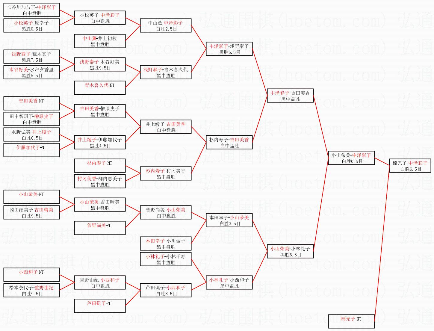 1.中泽彩子获得冠军,楠光子获得亚军。决赛比分:中泽彩子2:1楠光子。棋局: