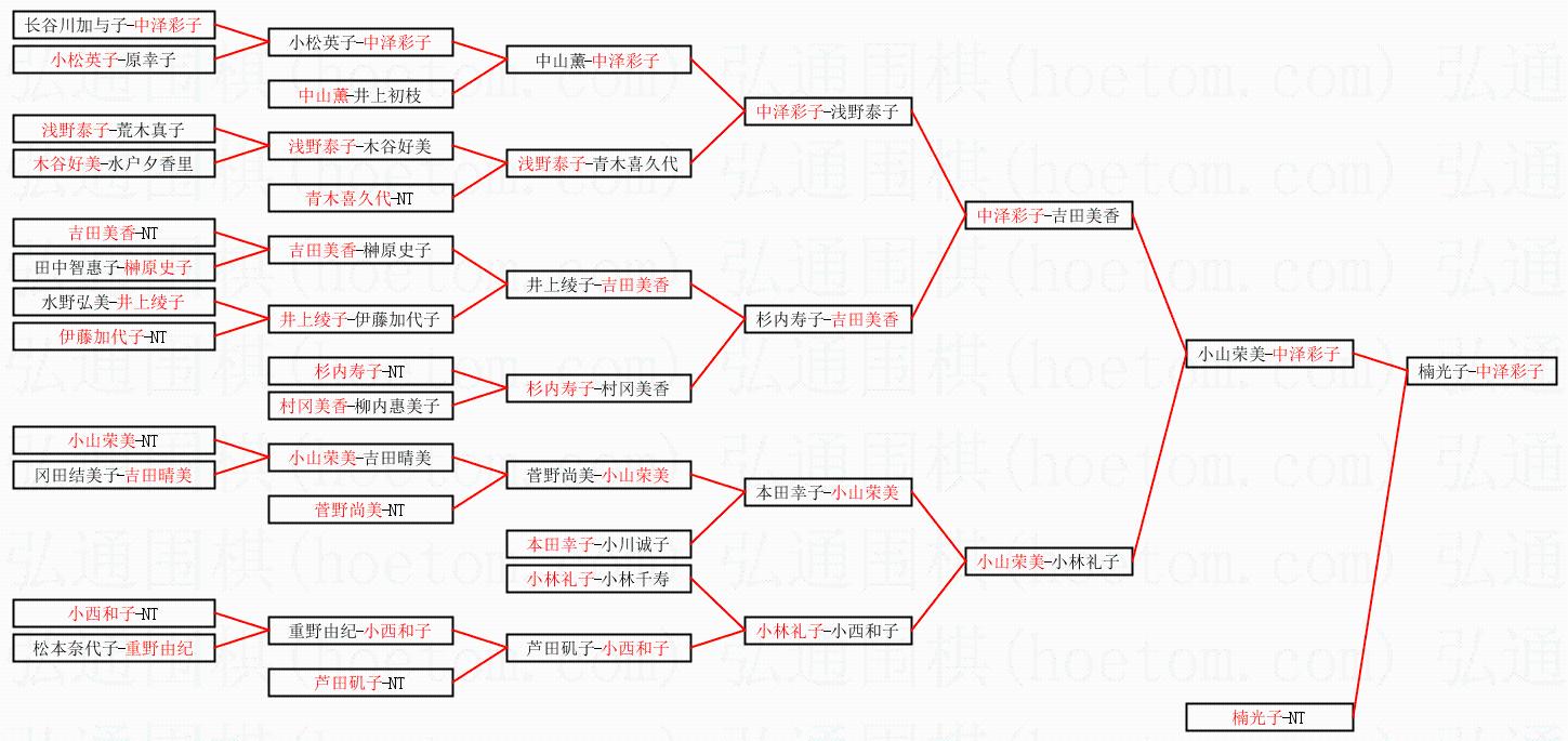 1.中泽彩子获得冠军,楠光子获得亚军。决赛比分:中泽彩子2:1楠光子。棋局: