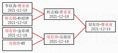 1.曹承亚获得冠军,郑有珍获得亚军。决赛比分:曹承亚1:0郑有珍。棋局: