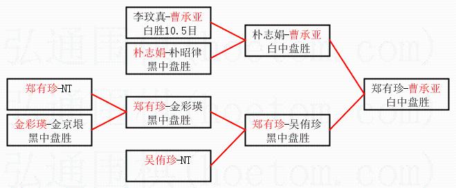 1.曹承亚获得冠军,郑有珍获得亚军。决赛比分:曹承亚1:0郑有珍。棋局: