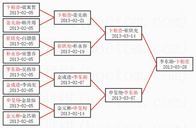 1.卞相壹获得冠军,李东勋获得亚军。决赛比分:卞相壹1:0李东勋。棋局: