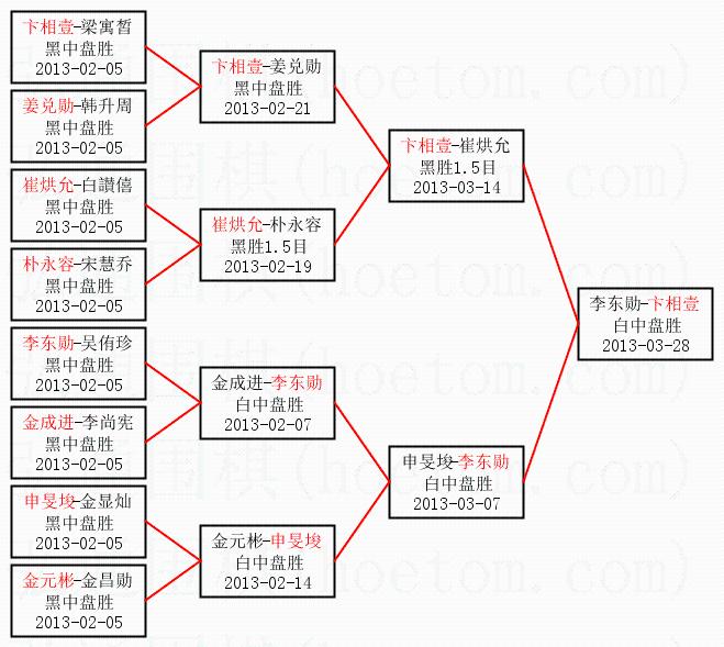 1.卞相壹获得冠军,李东勋获得亚军。决赛比分:卞相壹1:0李东勋。棋局: