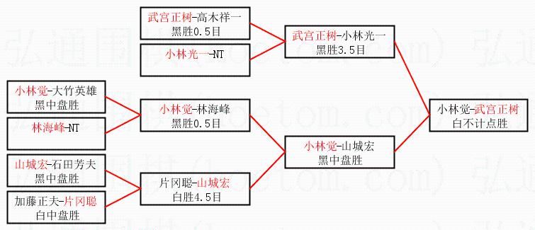 1.武宫正树获得冠军,小林觉获得亚军。决赛比分:武宫正树1:0小林觉。棋局:
