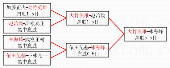 1.大竹英雄获得冠军,林海峰获得亚军。决赛比分:大竹英雄1:0林海峰。棋局: