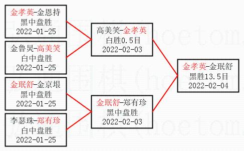 1.金孝英获得冠军,金珉舒获得亚军。决赛比分:金孝英1:0金珉舒。棋局: