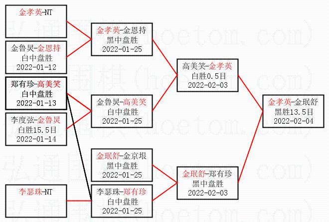 1.金孝英获得冠军,金珉舒获得亚军。决赛比分:金孝英1:0金珉舒。棋局: