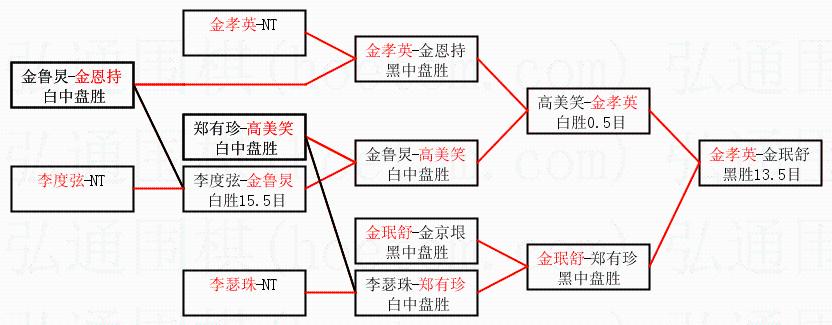 1.金孝英获得冠军,金珉舒获得亚军。决赛比分:金孝英1:0金珉舒。棋局: