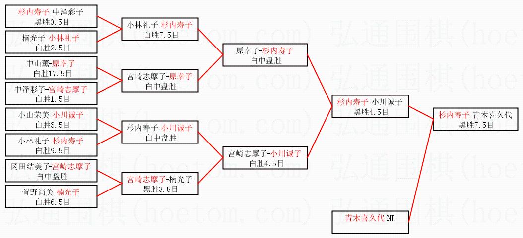 1.杉内寿子获得冠军,青木喜久代获得亚军。决赛比分:杉内寿子2:1青木喜久代。棋局: