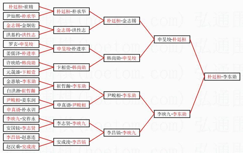 1.朴廷桓获得冠军,李东勋获得亚军。决赛比分:朴廷桓2:0李东勋。棋局: