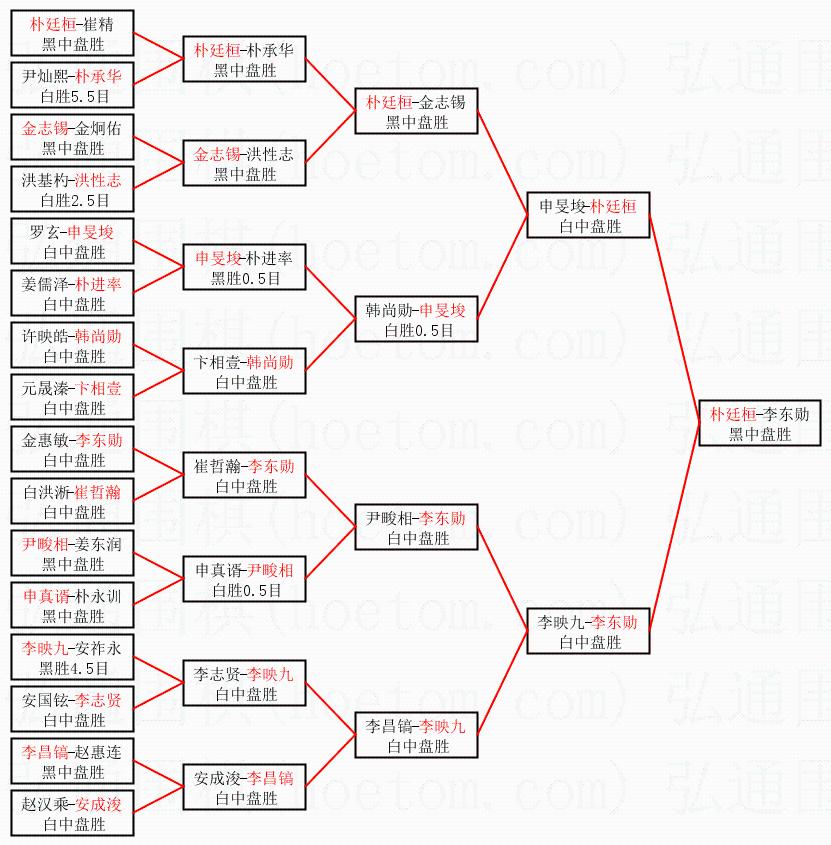 1.朴廷桓获得冠军,李东勋获得亚军。决赛比分:朴廷桓2:0李东勋。棋局: