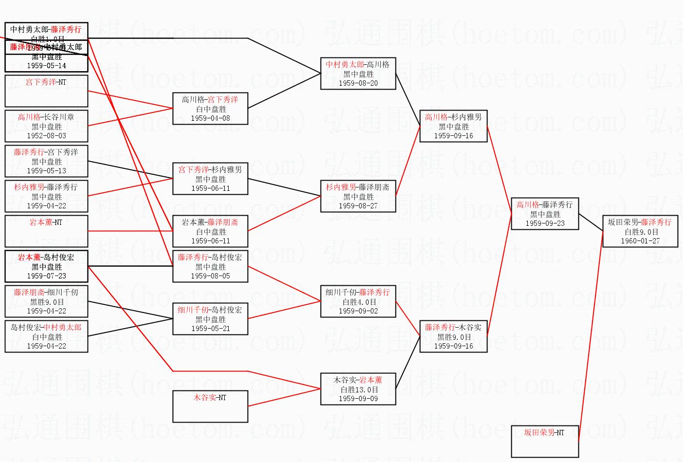 1.藤泽秀行获得冠军,坂田荣男获得亚军。决赛比分:藤泽秀行3:1坂田荣男。棋局: