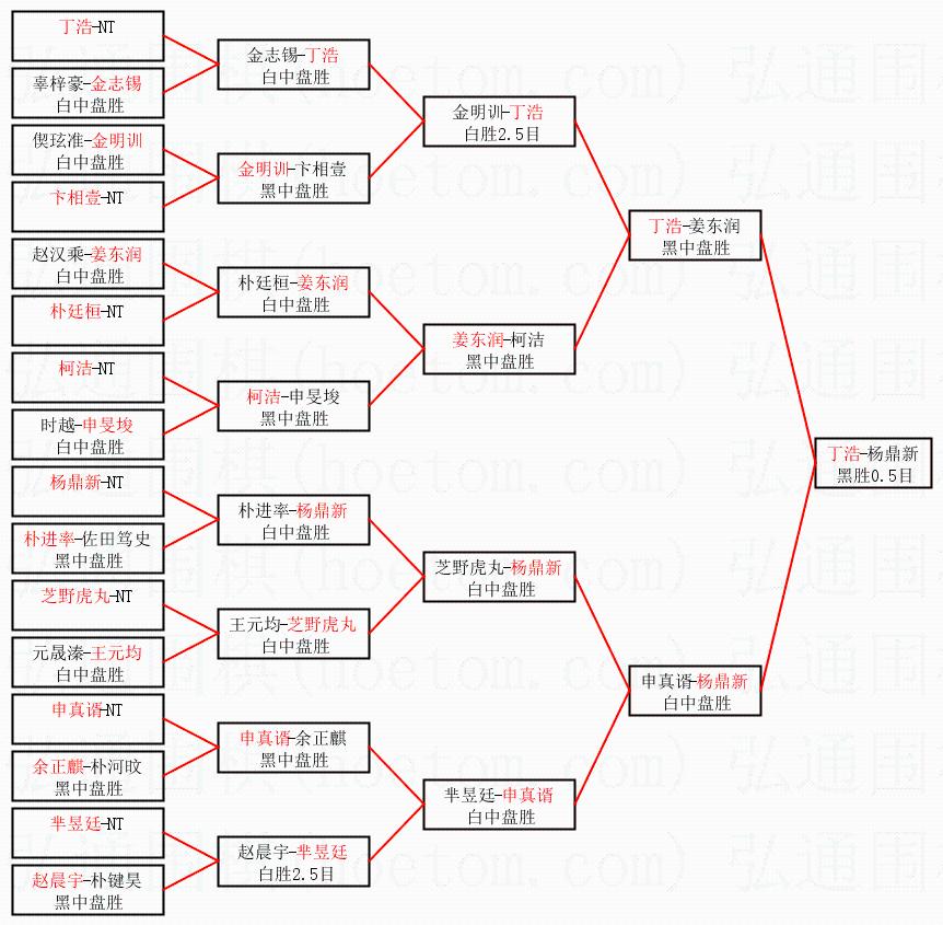 2.上半区半决赛丁浩获胜, 比分:丁浩 1:0 姜东润。棋局: