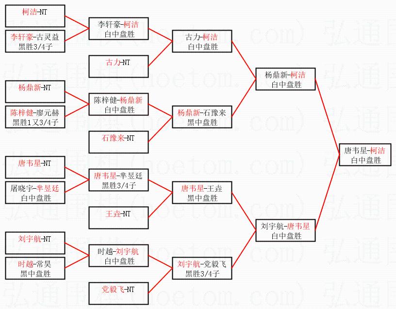 1.柯洁获得冠军,唐韦星获得亚军。决赛比分:柯洁1:0唐韦星。棋局: