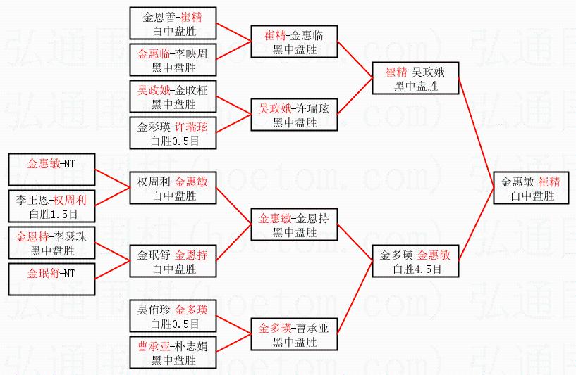 1.崔精获得冠军,金惠敏获得亚军。决赛比分:崔精2:0金惠敏。棋局: