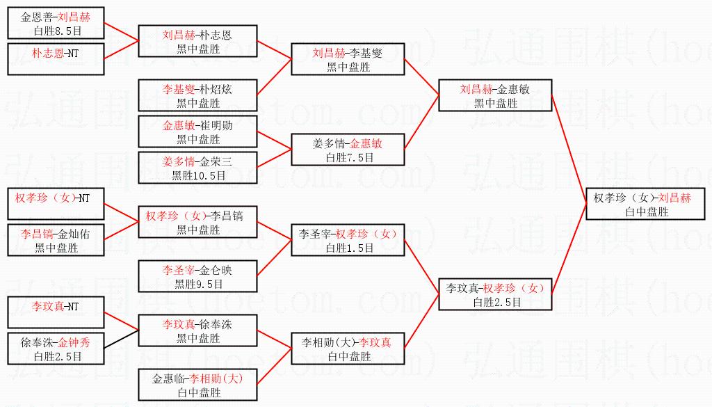 1.刘昌赫获得冠军,权孝珍(女)获得亚军。决赛比分:刘昌赫1:0权孝珍(女)。棋局: