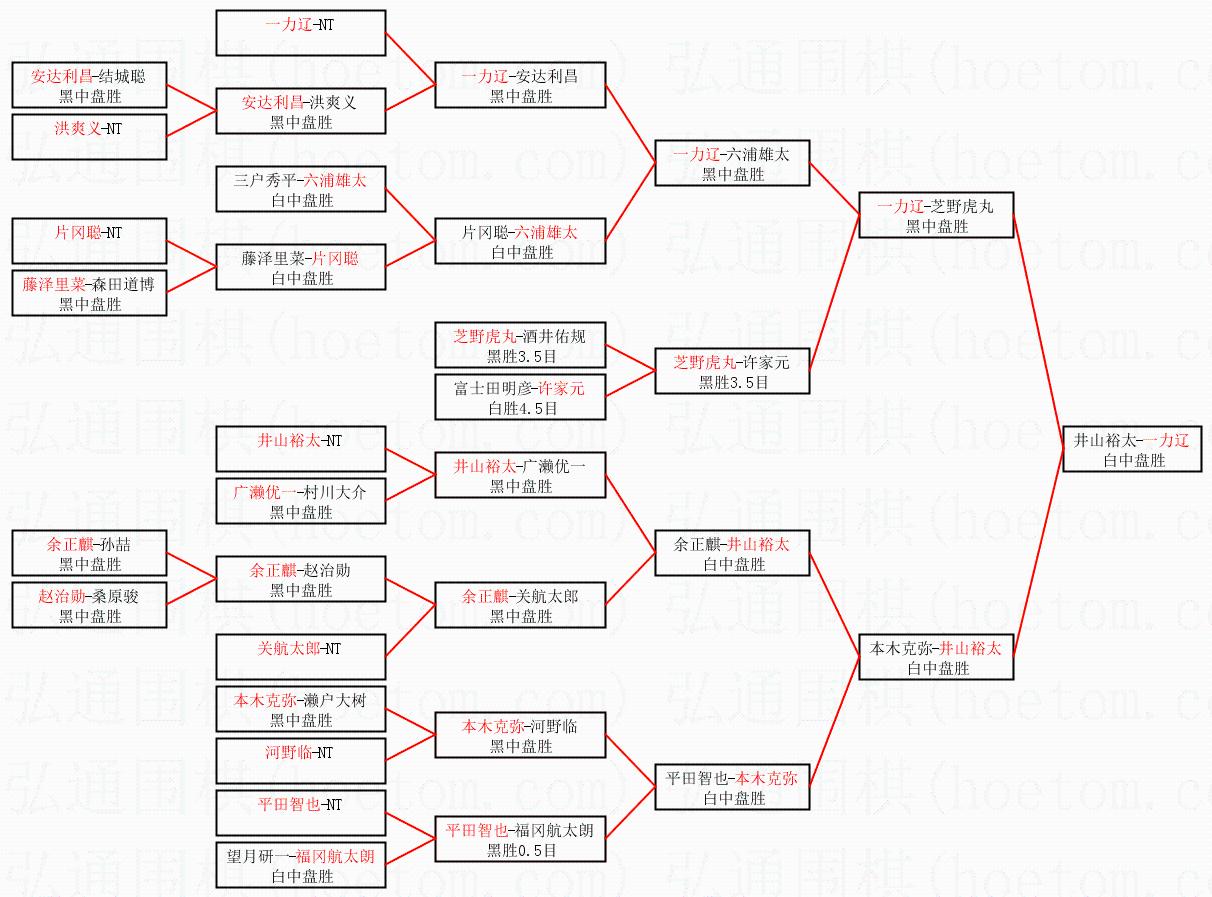 1.一力辽获得冠军,井山裕太获得亚军。决赛比分:一力辽1:0井山裕太。棋局: