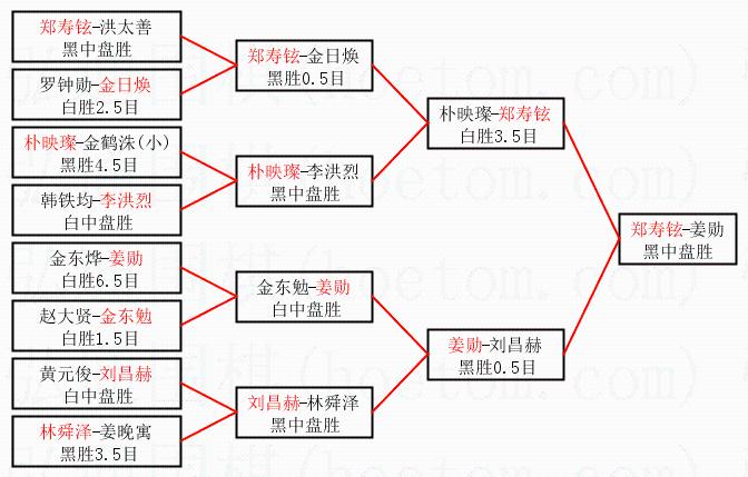 1.郑寿铉获得冠军,姜勋获得亚军。决赛比分:郑寿铉2:1姜勋。棋局: