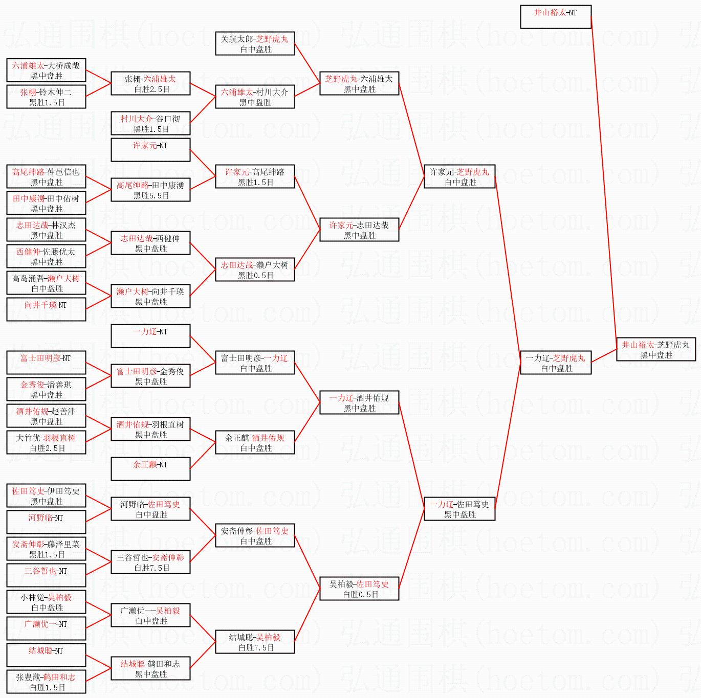 1.井山裕太获得冠军,芝野虎丸获得亚军。决赛比分:井山裕太3:1芝野虎丸。棋局: