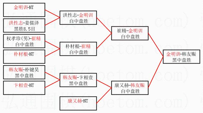 1.金明训获得冠军,韩友赈获得亚军。决赛比分:金明训1:0韩友赈。棋局: