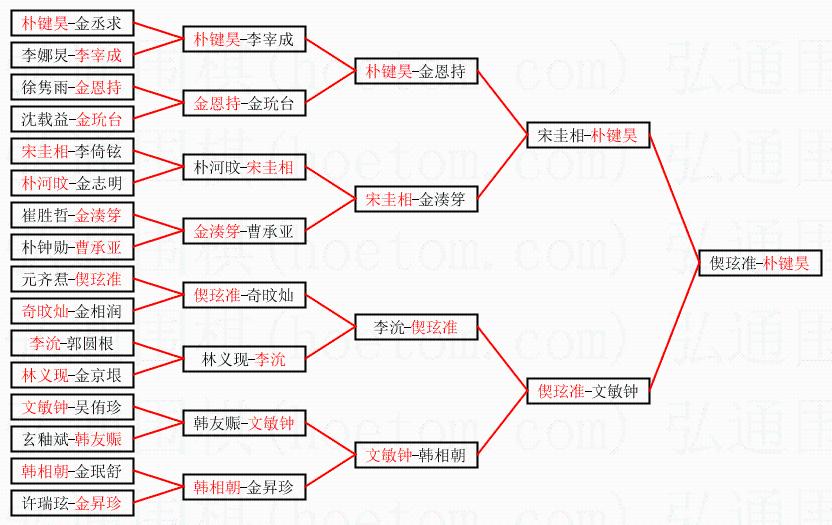 1.朴键昊获得冠军,偰玹准获得亚军。决赛比分:朴键昊2:1偰玹准。棋局: