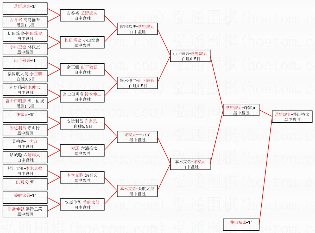 1.芝野虎丸获得冠军,井山裕太获得亚军。决赛比分:芝野虎丸3:0井山裕太。棋局:
