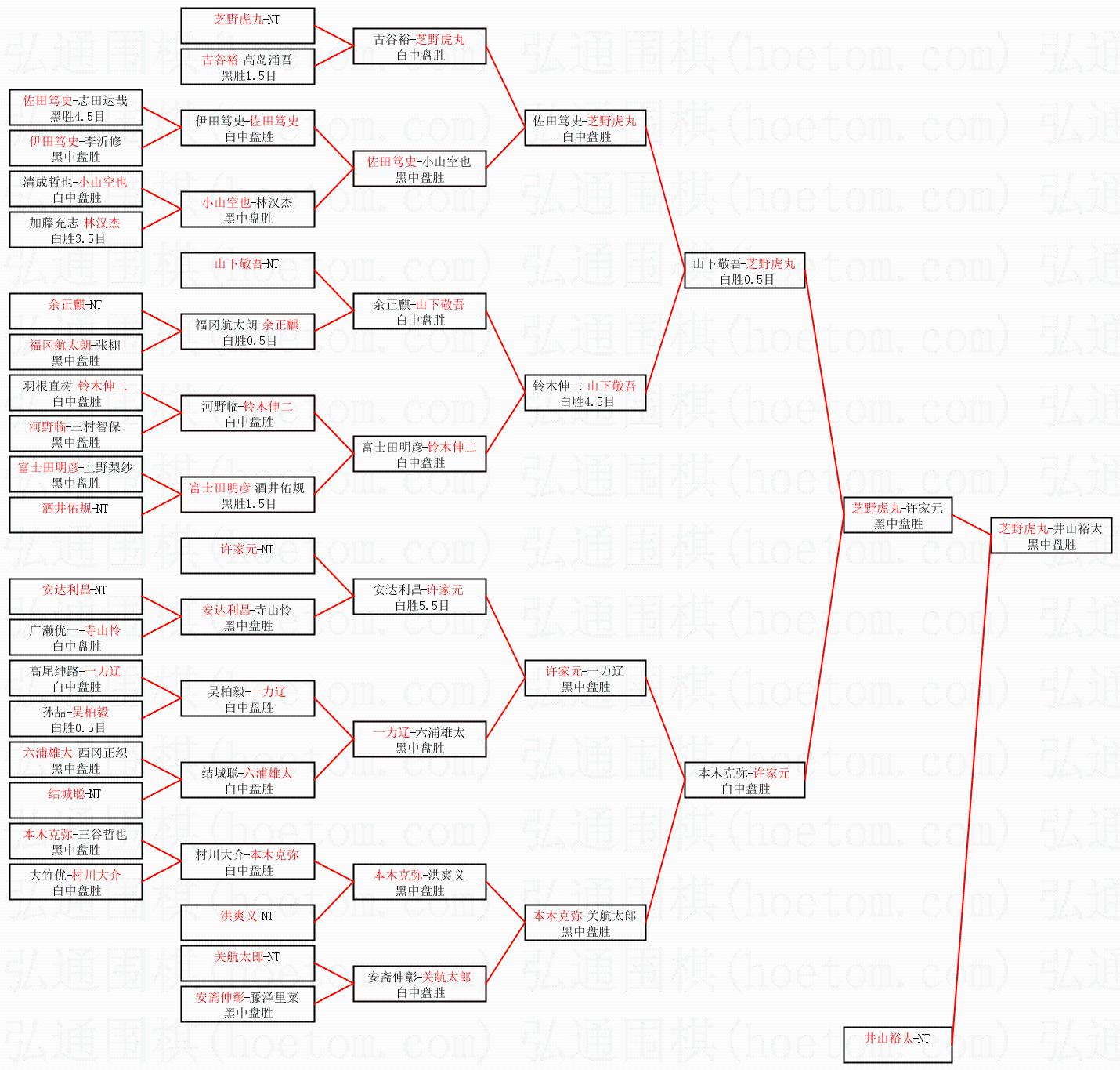 1.芝野虎丸获得冠军,井山裕太获得亚军。决赛比分:芝野虎丸3:0井山裕太。棋局: