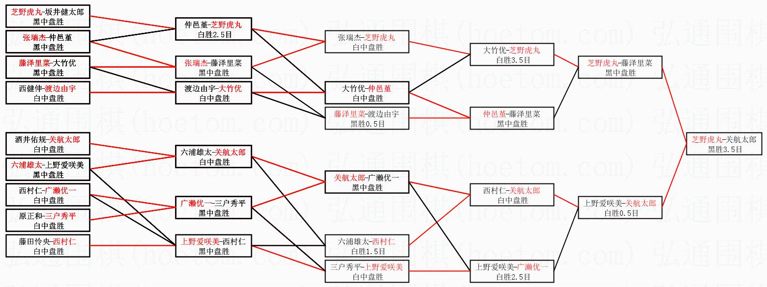 1.芝野虎丸获得冠军,关航太郎获得亚军。决赛比分:芝野虎丸2:0关航太郎。棋局: