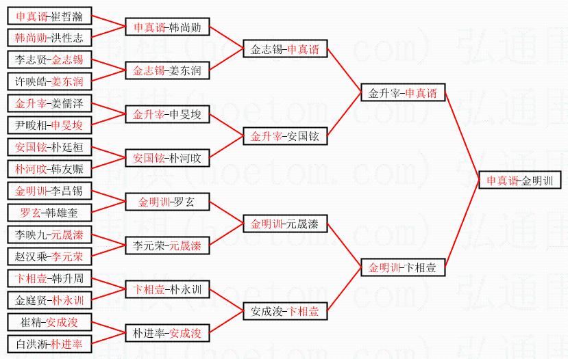 1.申真谞获得冠军,金明训获得亚军。决赛比分:申真谞2:0金明训。棋局: