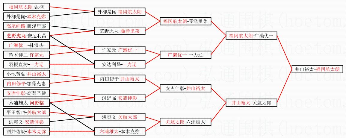 1.福冈航太朗获得冠军,井山裕太获得亚军。决赛比分:福冈航太朗1:0井山裕太。棋局: